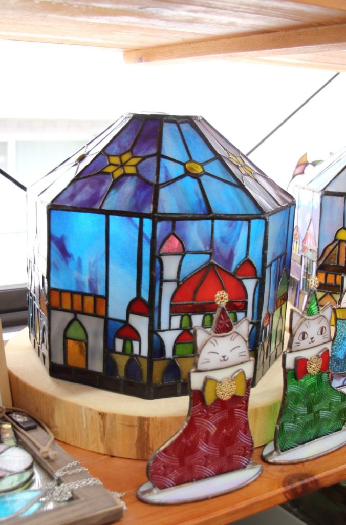 歯医者さん横の通路を通り抜けて、2階にあがると意外なほど静かで広く明るい空間がひろがっている。色とりどりの板ガラスが棚に並び、ランプをはじめ、できあがった作品たちが光を受ける。「ようこそ」と笑顔で出迎えてくれたのは、ここでステンドグラス教室を開く芹澤広子さん、ステンドグラス作家である。