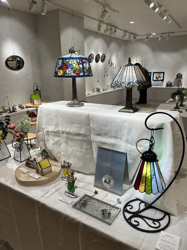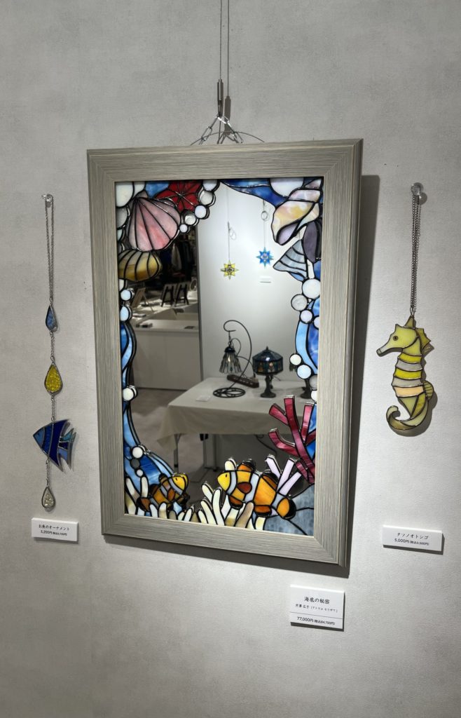 さまざまな苦労があったが、ついに2019年7月、「アトリエセリザワ」を開業する。その翌年にはコロナ禍で外出自粛要請が出るなど、厳しい状況でのスタートではあったが、現在では40名ほどの生徒さんがステンドグラスを楽しんでいる。アトリエセリザワの教室の特徴は様々な技法ができること。ステンドグラスの定番のティファニーランプなどの製作はもちろん、フュージング(板ガラスを電気釜で溶着する技法)、ガラスの絵付け、教室にはサンドブラスト(砂をガラスに吹き付けて模様を描く技法)の機械もある。また、教室の主宰だけでなく、ステンドグラス作家としてもここ数年百貨店などで展示会を開いている。
