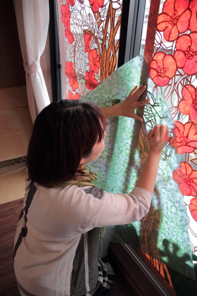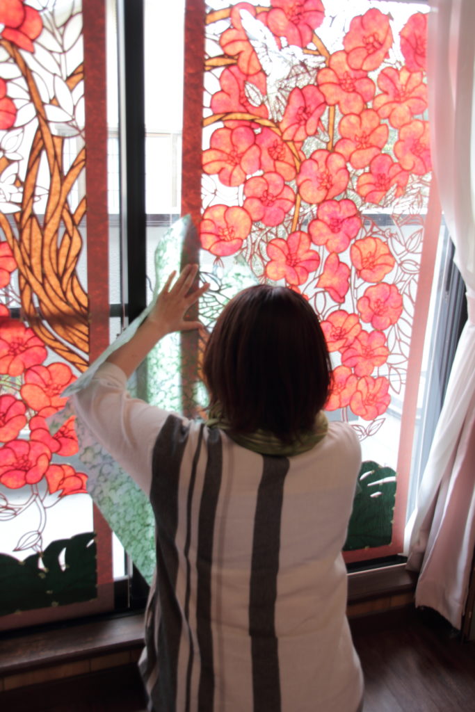 高橋さんがデザインした図案を切り絵として作成、それに辻さんが和紙を貼りアクリル板に挟み込み仕上げ、建具師の方によってふすまや欄間といった建具として完成する。切り絵の線は日本画にも通じるところがある。光を通す和紙は、昼は外からの日光、夜は室内の灯りによって、さながらステンドグラスのようにやわらかく輝く。令和7年6月には町立歴史文化資料館で初めての展示会を開催した。