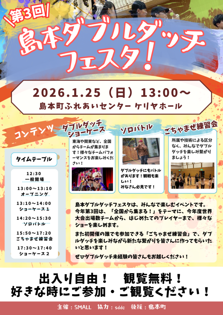 第3回 島本ダブルダッチフェスタ 開催決定! 「島本町をダブルダッチの聖地へ」 こんにちは、SMALLです! 昨年も開催いたしました「島本ダブルダッチフェスタ」 今年は、「全国から集まる!」をテーマに、今年度世界大会出場…