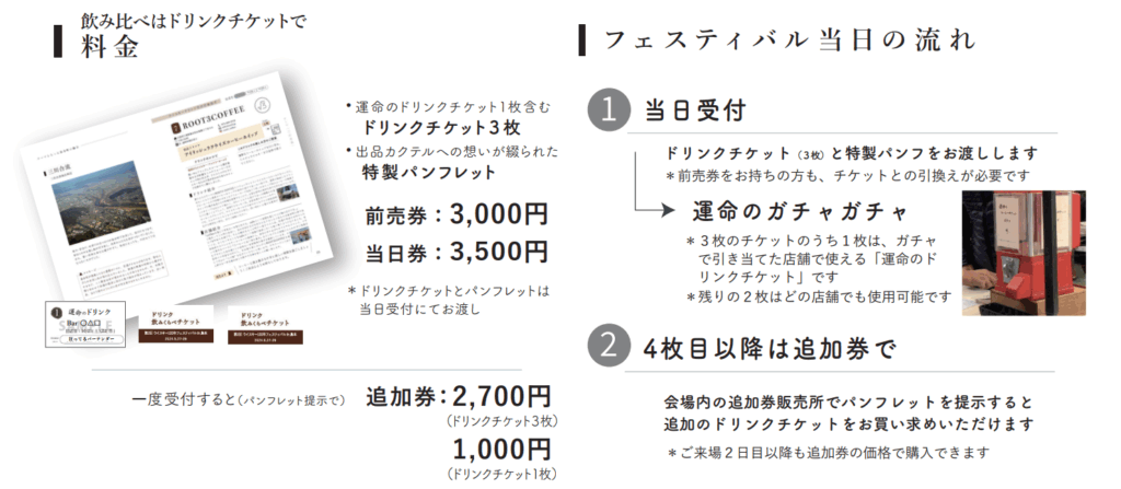 A 本部受付の際にイベントの趣旨を伝えます。3枚券1セット(追加券除く)につきパンフレットを1冊お渡しします。その内容は各出店者さんの紹介が載っており、お客様にはそのパンフレットを見ながら飲みたいウイスキーを選んでいただきます。その際にはバーテンダーとのコミュニケーションもお楽しみただけると思います。また、偶然の出会いを楽しんでいただきたく、1枚は運命のウイスキーチケットにしています。このような背景からチケット制を導入しています。